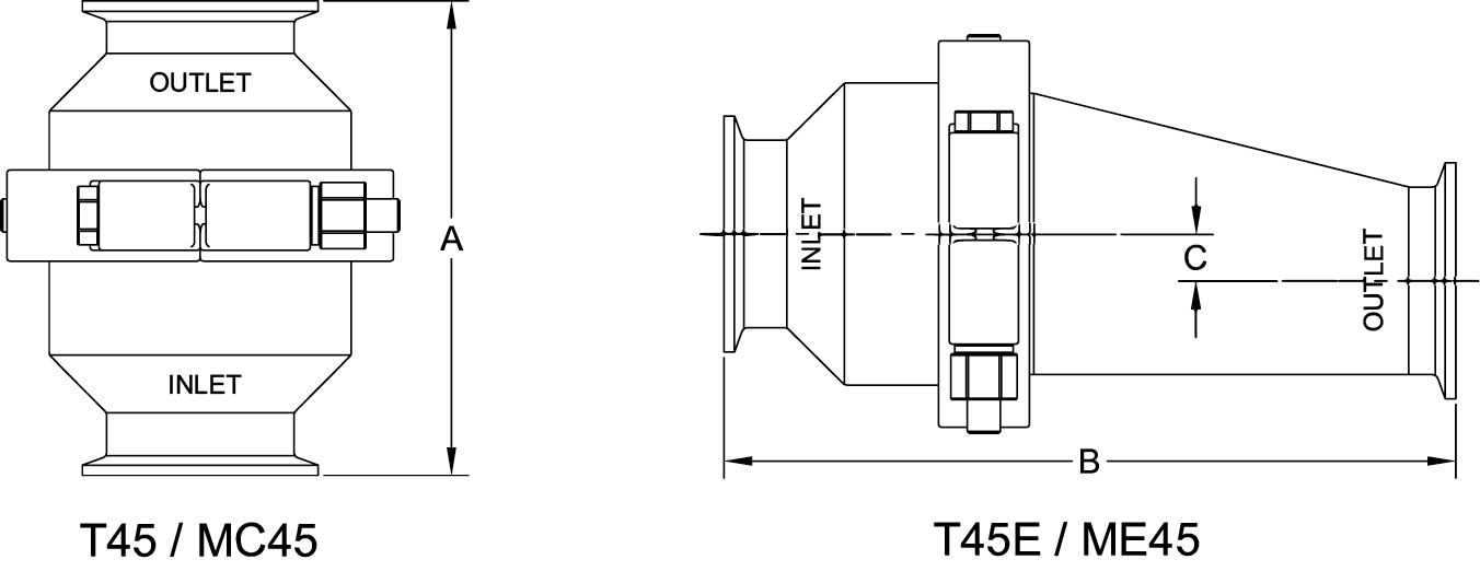 The TOP-FLO® 3A & BPE disc type 316L check valve can be used in a variety of hygienic processes depending on valve construction. Valves can be supplied either with clamp or extended butt weld type to facilitate orbital welding. Configurations in both concentric (T45/MC45) for vertical and eccentric outlet (T45E/ME45) for horizontal installation. Internal surface finishes available are BPE SF1, SF4, and SF5. Oxygen clean/cap/bag also available.